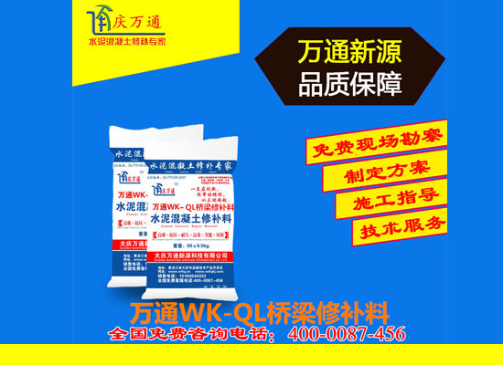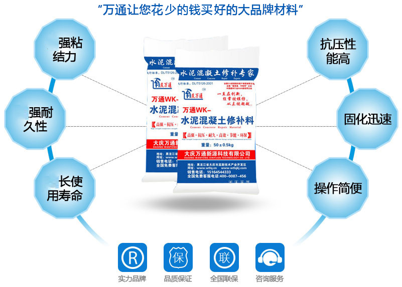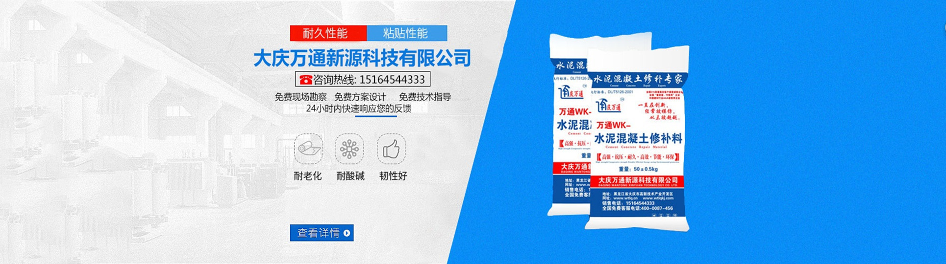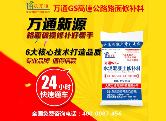 大慶萬通新源科技有限公司獨(dú)有的混凝土路面高強(qiáng)速補(bǔ)料,是水泥混凝土路面病害修復(fù)的好材料。疲勞、凍融循環(huán)、彎曲壓力、滲水和基層破壞等原因都會(huì)引起水泥路面的破損,從而帶來高昂的維護(hù)費(fèi)用。與以往的剛性修補(bǔ)方法不同,混凝土水泥路面維修速補(bǔ)膠提供了一種獨(dú)特的柔性修補(bǔ)產(chǎn)品和技術(shù),高柔性、高抗拉性,可跨伸縮縫施工和高抗壓性使得混凝土快補(bǔ)產(chǎn)品為水泥混凝土路面提供了******性的修補(bǔ)。傳統(tǒng)的剛性修補(bǔ)方案,如環(huán)氧砂漿和快干水泥產(chǎn)品,由于其自身的粘結(jié)失效,抗疲勞性低以及與原路面不同的伸縮系數(shù),修補(bǔ)面會(huì)在短時(shí)間內(nèi)失效或產(chǎn)生新的裂縫,需要反復(fù)修補(bǔ),有效期短且費(fèi)用高昂。大慶萬通新源科技有限公司的混凝土水泥路面維修速補(bǔ)膠可以隨原路面一起伸縮,移動(dòng),從而避免了粘結(jié)失效和產(chǎn)生新裂縫。萬通快補(bǔ)產(chǎn)品優(yōu)異的粘結(jié)性、柔韌性和高防滑性,特別適用于水泥路面的淺層粘合修補(bǔ),多邊角混凝土板層修補(bǔ),跨伸縮縫修補(bǔ)以及路面沉陷修補(bǔ)。萬通混凝土病害修補(bǔ)料針對混凝土起皮起沙、斷板裂縫、蜂窩麻面、坑槽露石子、漏筋掉皮、橋梁的掉皮漏筋快速通車使用時(shí)間長。應(yīng)用萬通快補(bǔ)產(chǎn)品,施工后一天就可以恢復(fù)交通。大慶萬通新源科技有限公司的萬通水泥路面維修速補(bǔ)膠適用于高速公路、機(jī)場路面、農(nóng)村村村通路面、廠坪、學(xué)校操場、市區(qū)公路、小區(qū)路面、橋梁、水泥路面的修補(bǔ)。使用萬通特快補(bǔ)材料修補(bǔ)路面可以一勞永逸! 水泥地面起砂怎么辦,混凝土修補(bǔ)劑混凝土地面起砂,混凝土地面修補(bǔ),地面起砂怎么辦,